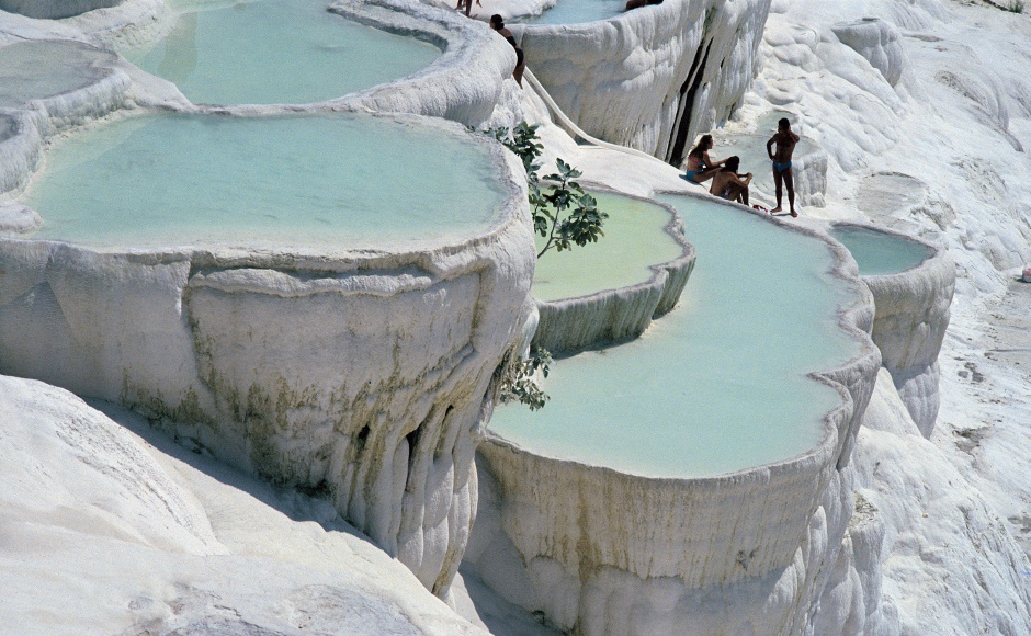 - トルコ語で「綿の城」という意味を持つパムッカレは、トルコでも有数の温泉保養地。白とブルーのコントラストが美しくも稀有な景観を作り出す石灰棚は、ユネスコ世界遺産に登録されている。パムッカレ周辺には古代遺跡もあり、中でも、紀元前190年頃に始まったペルガモン王国時代からの都市遺跡「ヒエラポリス」は、この時代の遺跡としては最も内陸に位置していることで知られ、トルコの見所のひとつとなっている