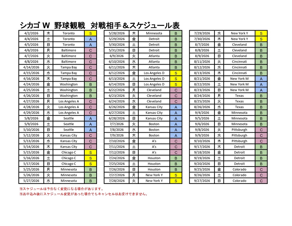 2026年シーズン シカゴW 野球観戦チケット(手配代行)