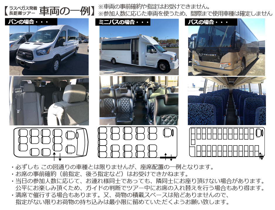 - 全行程陸路でのツアーになる為、交通事情などでスケジュール通りに進まない場合も多々ございます。特にラスベガスのお戻りは、状況によって大きく異なります。同日のナイトショーはセカンドショー(21~22時台の開演)であってもリスクがあります。間に合わなかった際の責任は負いかねます。