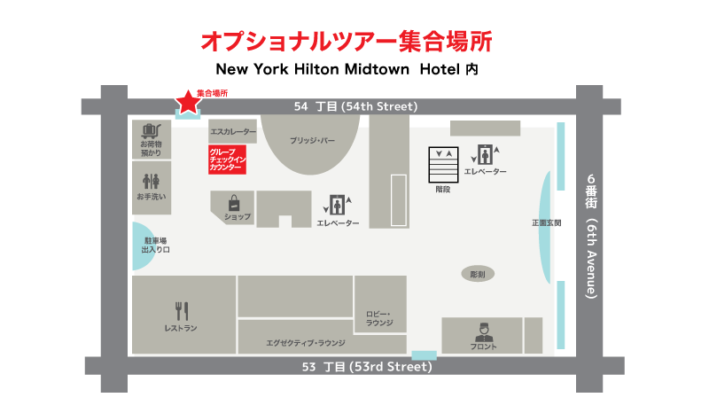 - 指定集合時刻前にはNEW YORK HILTON MIDTOWN 54丁目側出口外側にお集まりください。