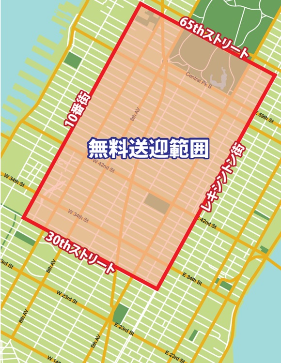 - 指定範囲内のホテル(マンハッタン中心部の「南北は30st~65st、東西はレキシントンave~10aveの間」)ならご滞在ホテルまで送迎、またはニューヨーク・ヒルトン・ミッドタウン