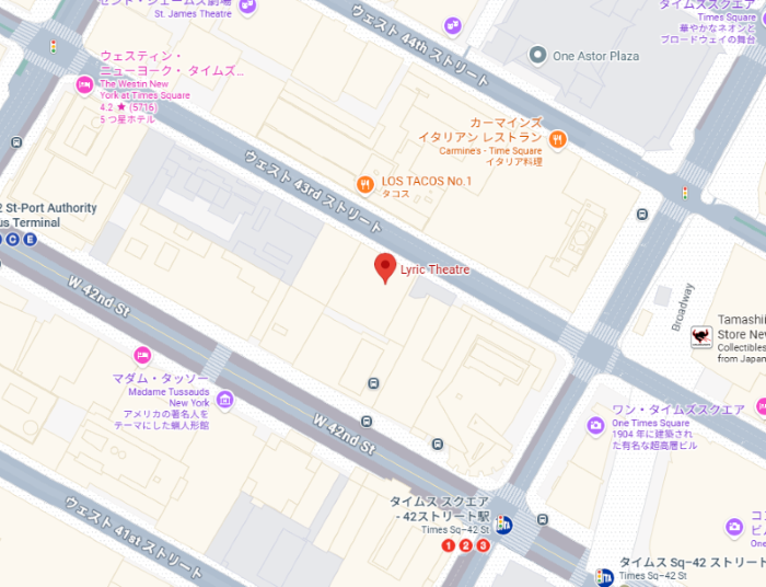 - 214 West 43rd Street, New York, NY 10036劇場の地図はこちら
