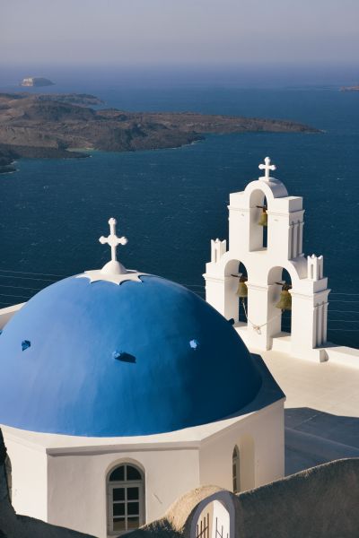 エーゲ海で最も人気の高い景勝地として知られる は、繰り返しの火山噴火や地震により、断崖絶壁が続く三日月形に島が形成された。ガイドブックでよく見かける青と白のコントラストが眩しい街は 。島の頂に位置し、どこからでも絵になる美しい写真が撮れる。街にはカフェやお土産屋が連なり、ショッピングや休憩を挟みながら絶景を眺めるフィラの散策は欠かせない。