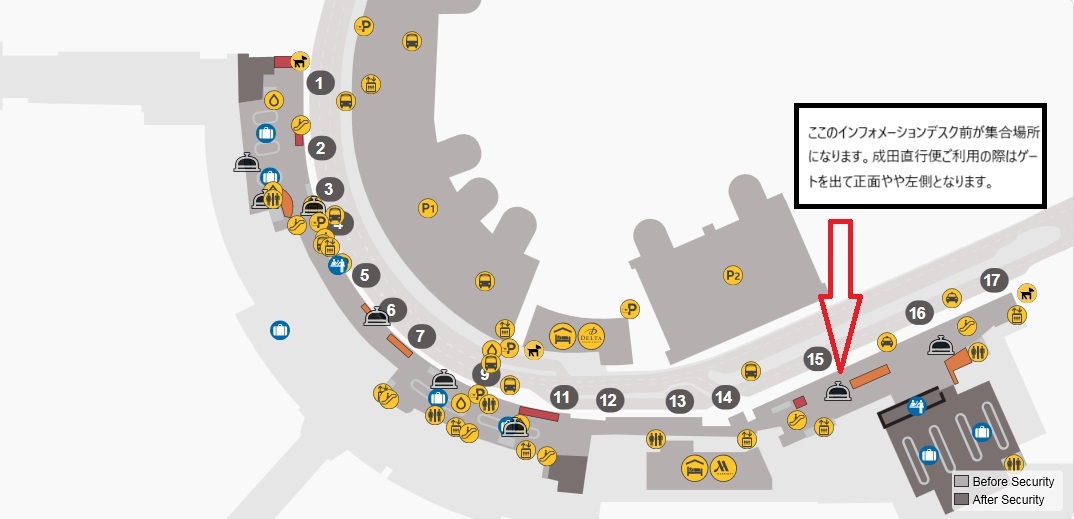 (注)現在、空港到着ロビー階には3つインフォメーションセンターがあります。④近辺、⑦~⑨の間、⑮近辺です。お間違いのないようお気を付けください。