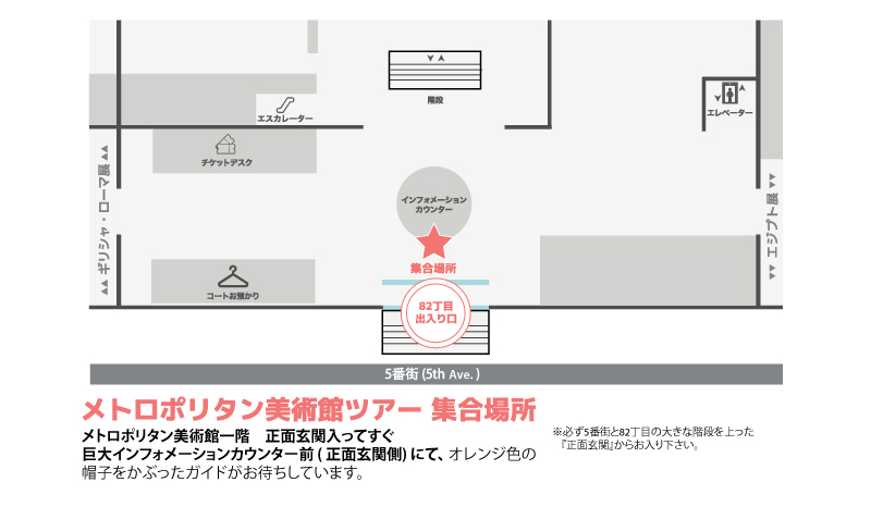 - 14:00 メトロポリタン美術館 5番街82丁目の大階段上の正面玄関を入ってすぐ 巨大インフォメーションカウンター前 ( 正面玄関側) にてオレンジ色の帽子をかぶったガイドがお待ちしています